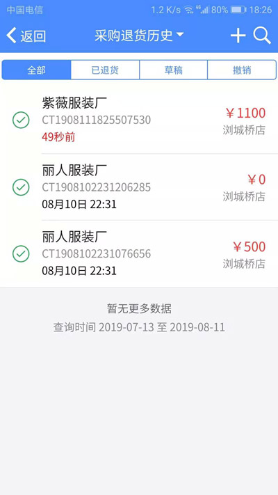 采购进货历史:列出所有采购的历史记录,可以按供应商、单号、日期进行筛选历史记录