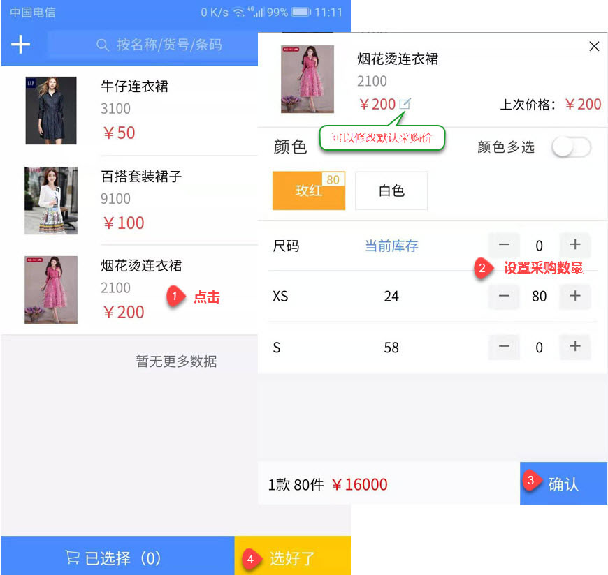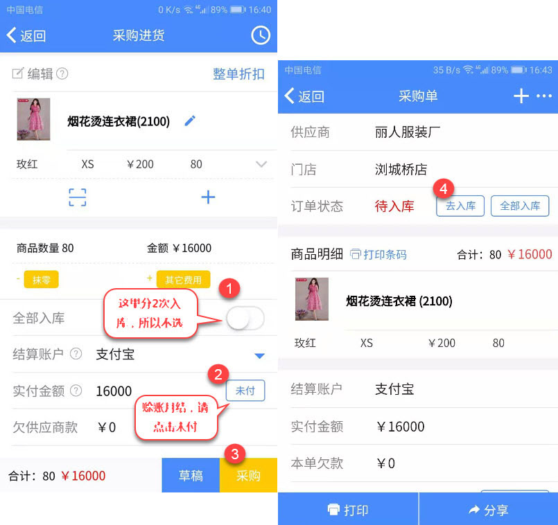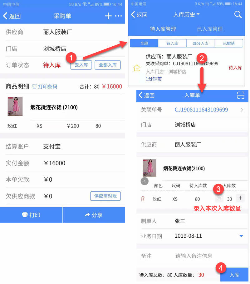 如:小明向供应商采购80件烟花烫连衣裙,但是供应商由于某些原因库存不足,所以先发30件,在有货后再发50件。小明在收到30件后入库一次,收到50件后再入库一次,至此整个采购流程完成