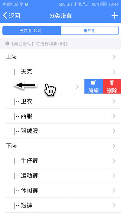 用手指轻轻向左滑动要删除的分类,会弹出一组按钮,点击【删除】即可