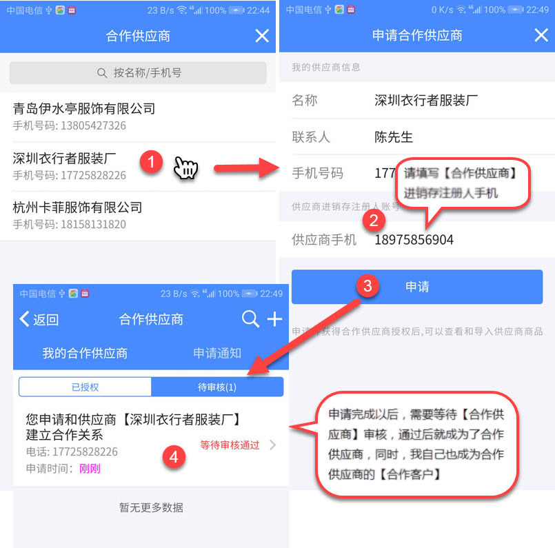 申请提交后,就需要等待合作供应商【深圳衣行者服装厂】登录他自己的账号,来审核