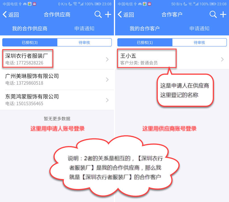 如:深圳衣行者服装厂是【李黎明】的合作供应商,李黎明就是【深圳衣行者服装厂】的合作客户,