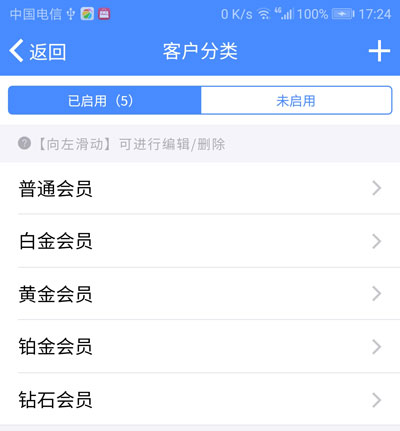 为了确保数据的完整准确性,客户分类一旦被使用,就无法删除,只能停用