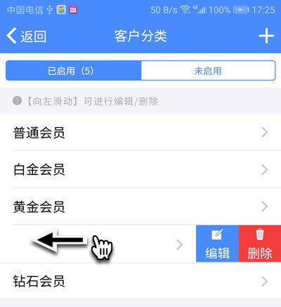 手指按住要删除的会员分组名称,轻轻地向左滑动,就会弹出【删除】按钮