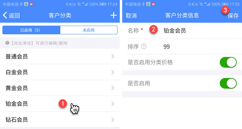 使用手指点击要编辑的客户分类名称,即可弹出客户分类编辑页面