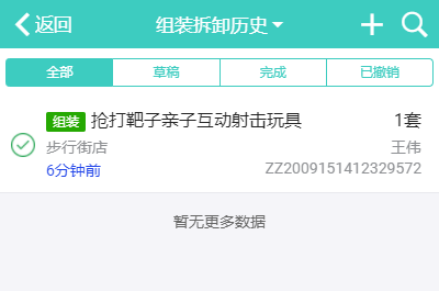 点击右上角的【放大镜】图标,可以按单据类型、组合件商品、单号、门店筛选历史记录