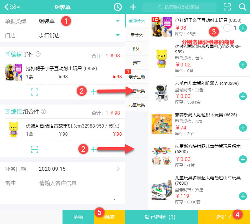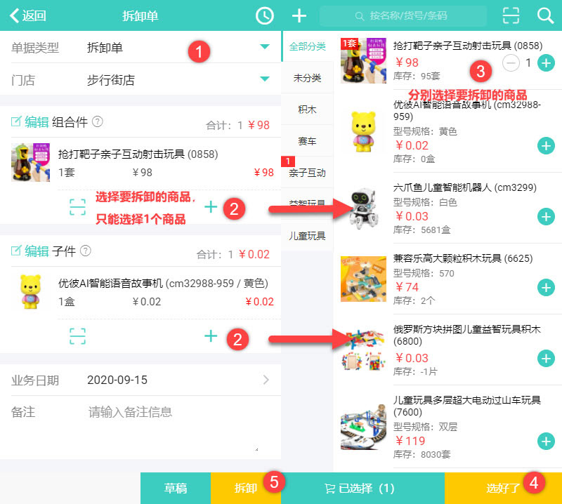 组装商品或者拆卸商品,很多行业,需要几个商品或者半成品组装成一个成品进行销售;或者一个成品拆卸成几个小件进行销售或使用的。在电脑行业或者其他小型生产行业中经用用到这个功能。