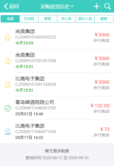 采购进货历史:列出所有采购的历史记录,可以按供应商、单号、日期进行筛选历史记录
