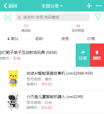 在商品列表页面,使用手指在要分享的商品上轻轻向左滑动,会出来【分享】按钮,点击即可分享当前商品给朋友