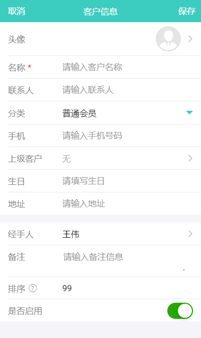在客户列表页面,点击【+】号,进入添加客户页面,按需填写信息即可
