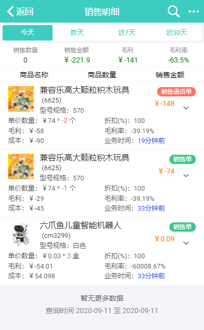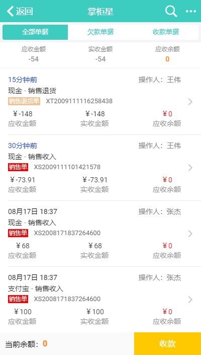 在客户明细页面,点击【当前余额】,可以查看客户对账数据、收款、退款记录