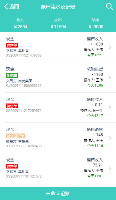 对于采购单、采购退货单、销售单、销售退货单、零售单的产生的资金流水是无法修改的,点击它们会进入对于的单据明细