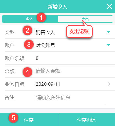 点击资金流水页面底部的【记一笔】进入收入或支出记账页面: