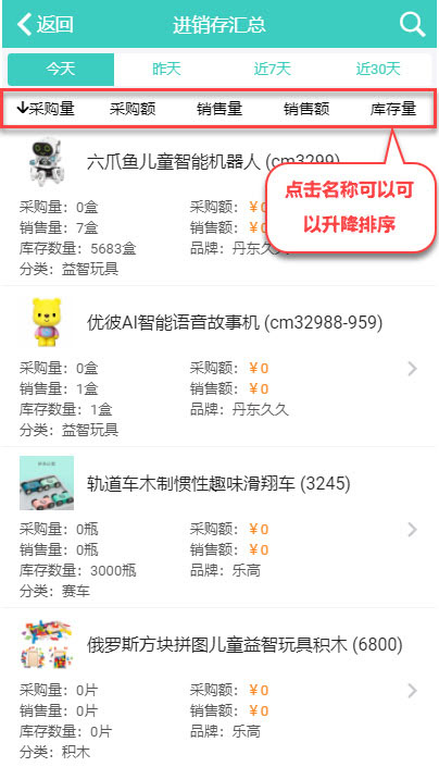 点击报表标题名称(库存量、销售量、采购量、销售额),可以升序或降序排列