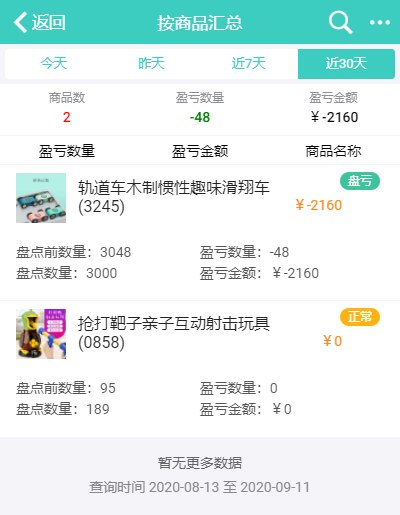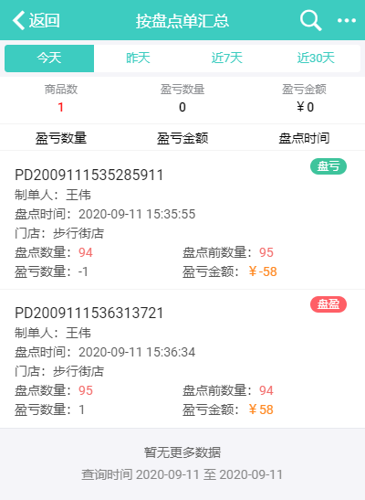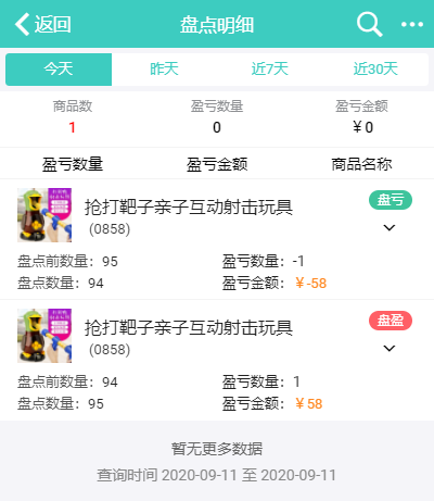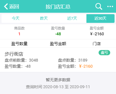 通过盘点报表可以查看不同时间段的盘点明细、盘点商品数、盈亏金额、盈亏数量等信息;并且可按盘点明细、盘点单、商品、门店等维度汇总统计