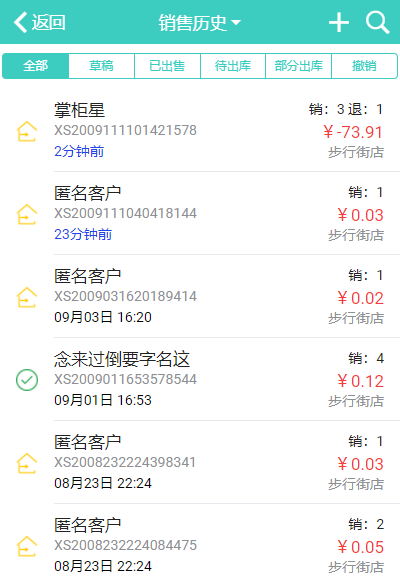 可以按客户、单号、门店、销售员、退款记录、单据日期筛选历史记录