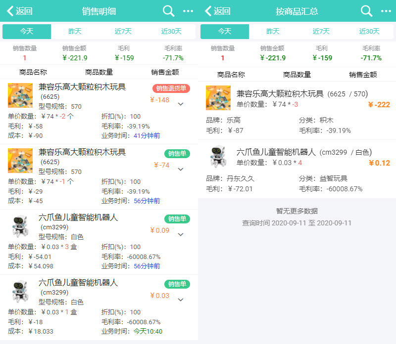 1、销售明细、按商品汇总