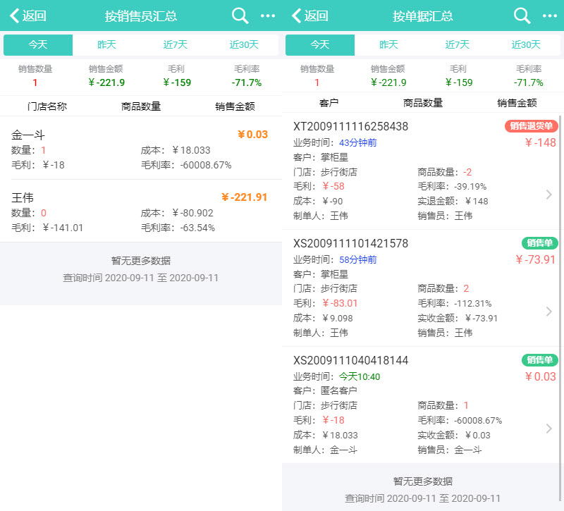 4、按销售员汇总、按单据汇总