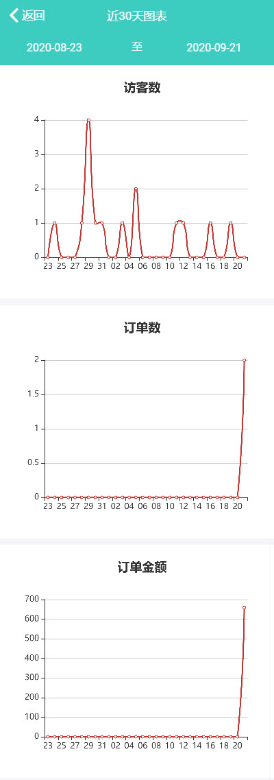 通过可视化图表来展现时间范围内的访客数、订单数、订单金额