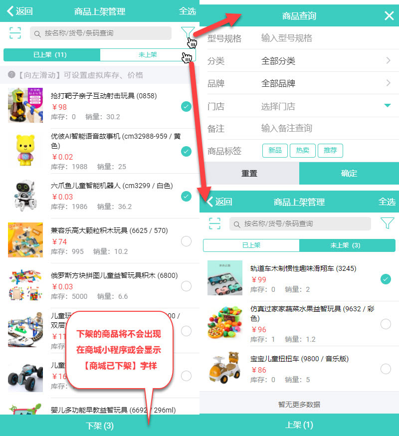 管理商城小程序的商品上架与下架,下架的商品不会出现在商城小程序的产品列表中