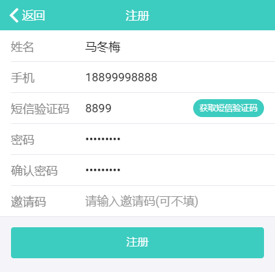 依次输入:姓名、手机号码、短信验证码(点击【获取短信验证码】获取),密码、确认密码