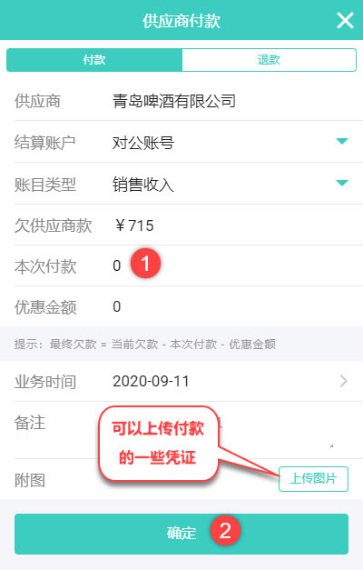 供应商对账:针对供应商的某个单据进行付款(在开采购单时,实付金额请写0,就会产生付款单据)