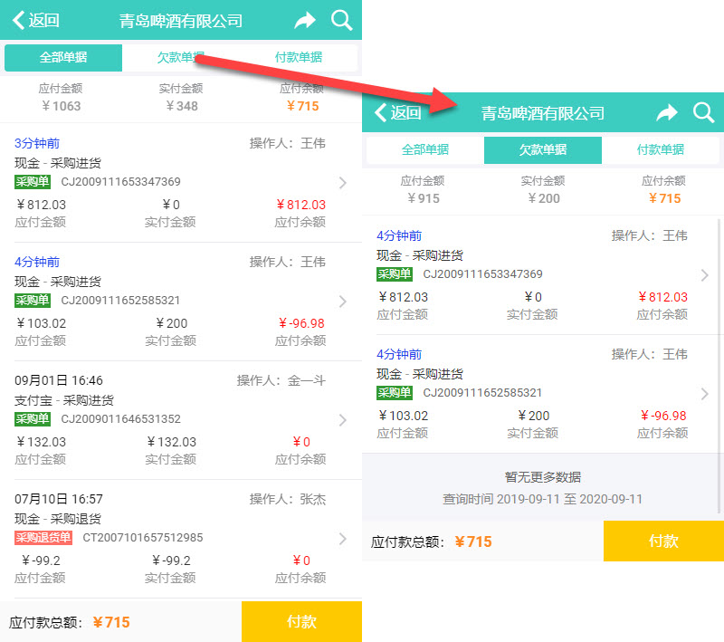 点击供应商对账页面的【紫薇服装厂】进入查看供应商详情,在点击【欠供应商款】右侧的箭头进入对账页面