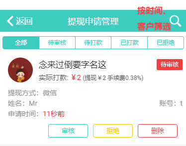 管理分销佣金提现申请,点击筛选按钮可以按时间、客户进行筛选