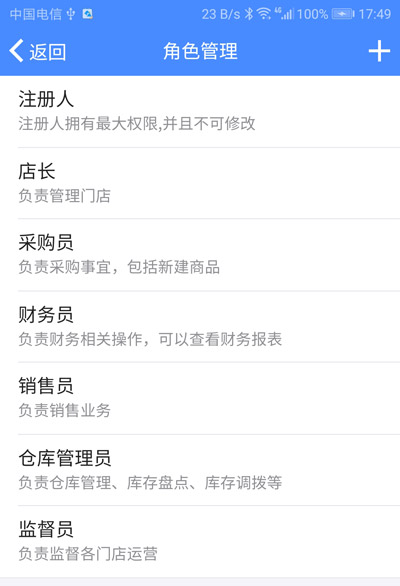 内置的角色有:注册人(权限最大,相当于超级管理员)、店长、采购员、销售员、仓库管理员。