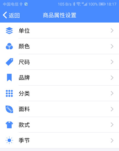 商品属性主要有:单位、颜色、尺码、品牌、分类、面料、款式、季节,如下图所示