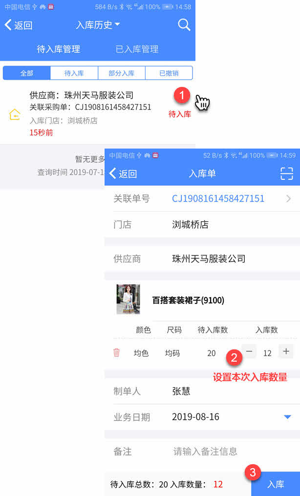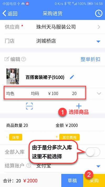 如:向供应商采购 百搭套装裙 均色-均码 20件,供应商分2此将货发给你: