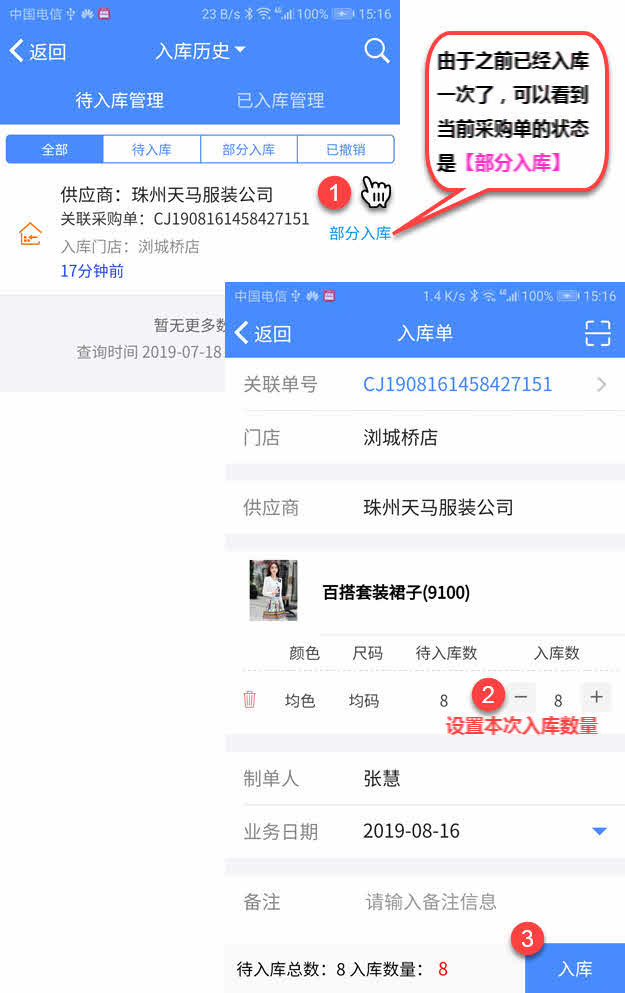 过了一段时间后,收到12件货后,进行第一次入库。本次入库以后当前采购单的状态是【部分入库】,表示只有部分货品入库