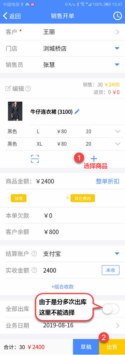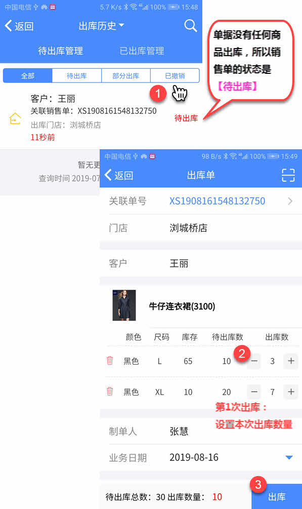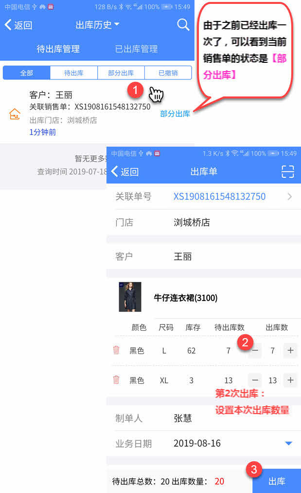 本次出库以后,当前销售单的状态是【部分出库】,表示只有部分货品出库