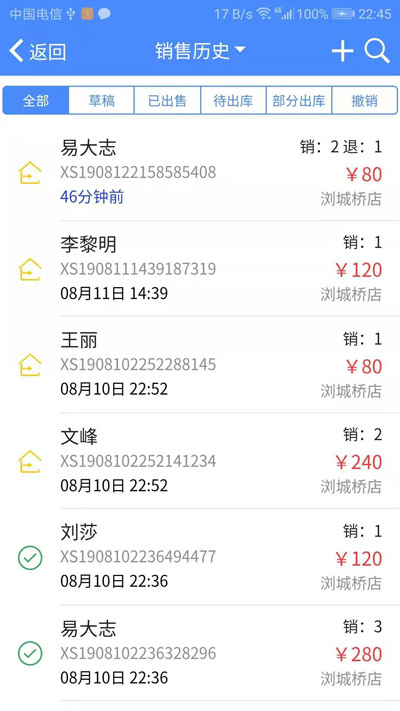 点击右上角的【放大镜】图标,可以按客户、单号、门店、销售员、退款记录、单据日期筛选历史单据