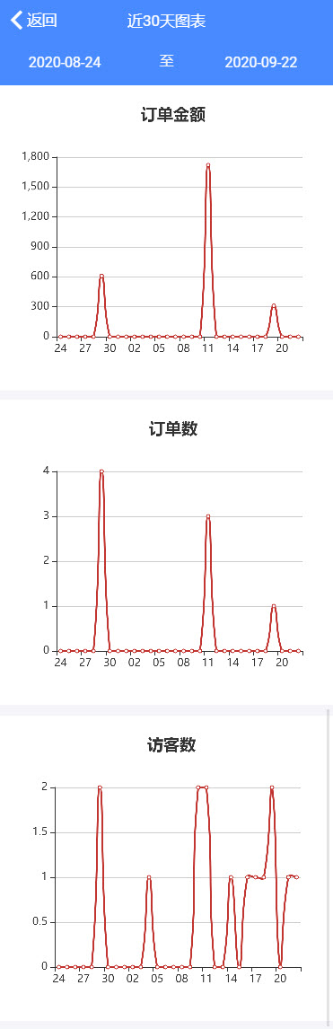 通过可视化图表来展现时间范围内的访客数、订单数、订单金额