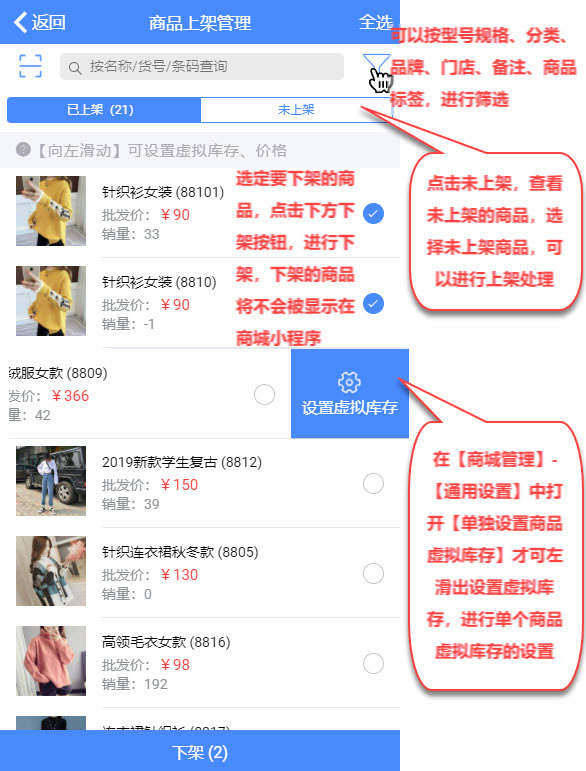 管理商城小程序的商品上架与下架,下架的商品不会出现在商城小程序的产品列表中