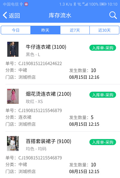 点击右上角的查询图标,可以按时间、商品名称货号条码、门店、分类、品牌、颜色、尺码查询