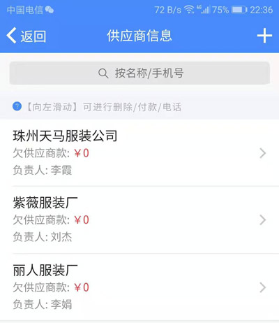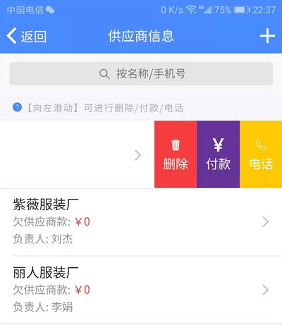 使用手指按住要删除的供应商,轻轻向左滑动,会出现【删除】按钮,点击确认有可以删除