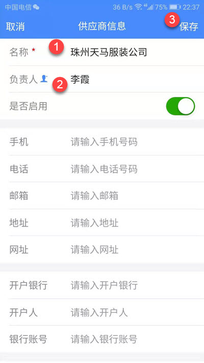 点击右上角+号,进入添加供应商页面: