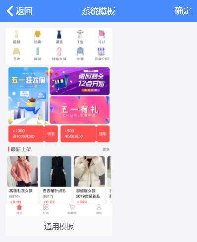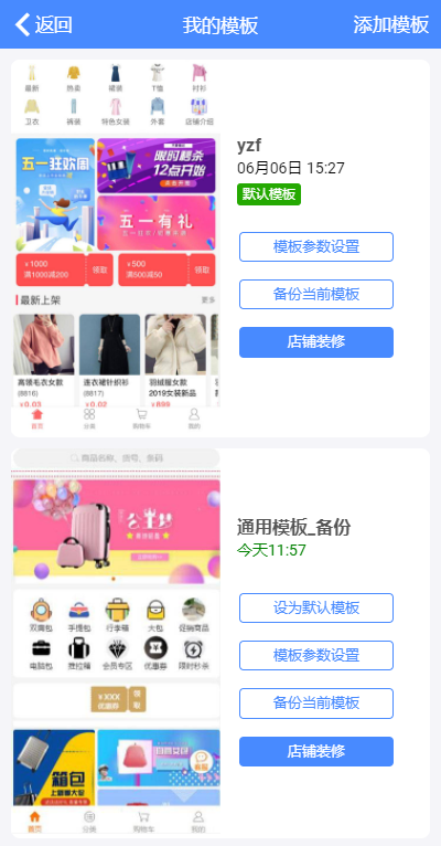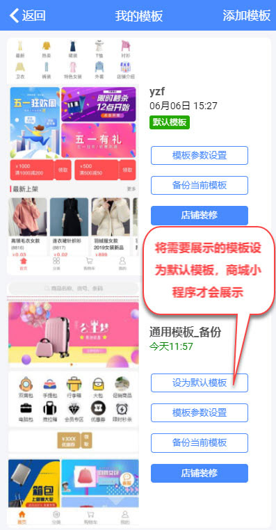 点击【设为默认模板】并确认。只有默认模板才是商城小程序展现的模板,所以将需要展现的模板设为默认模板