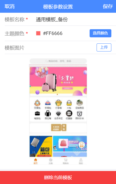 点击【模板参数设置】来管理模板名称主题颜色等参数,点击【删除】按钮可以删除当前模板