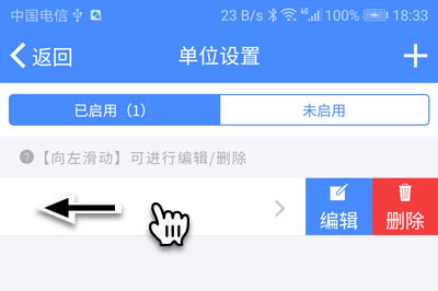用手指轻轻向左滑动要删除的单位,会弹出一组按钮,点击【删除】即可