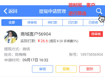 管理分销佣金提现申请,点击筛选按钮可以按时间、客户进行筛选